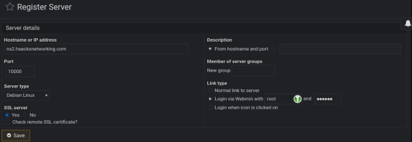 As you can see above, we are using the “Login via Webmin with” option with our root user's UNIX credentials, which webmin leverages via pam. If you did not do so already, make sure to log in as root on each node, and set a unique 25 or larger character password with special characters, capitals, and no dictionary words. Use a generator like KeepassXC or Nextcloud Passwords. The key is random, unique, and large. So long as you got that in place, TLS and regular cron updating of your certs takes care of the rest, as does maintaining and patching each node. Again, if you are paranoid and/or have a rare qualifying use-case, you can certainly source-IP 80/443 on the master domain, ns1.haacksnetworking.com, but I'm content leaving the rest to fail2ban.